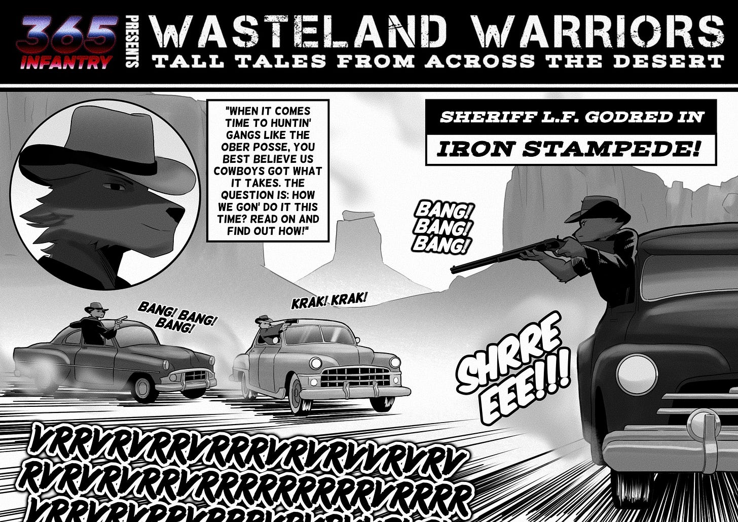 When we heard the cracks of rifles and the hollering of wolves, we knew our iron stampede was starting to make its moves. Sure enough, they started in the direction we was angling. When more of the Ascensores got into the mix, these creeps started to try and take our rides. You could see ol’ one-eyed Ober licking his lips and firing like mad from behind the wheel of his ol’ beat-up Ford.